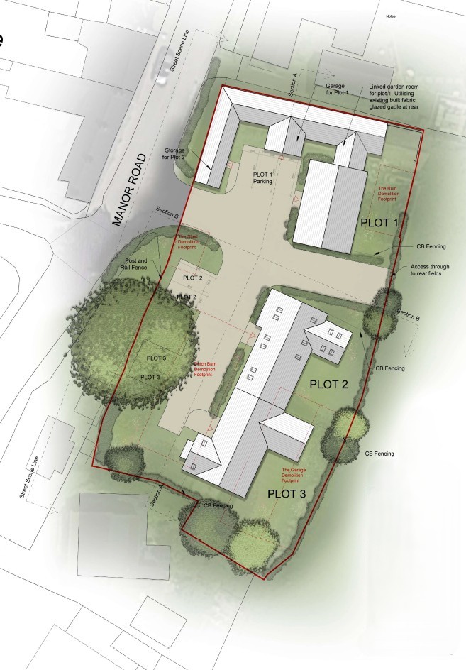 Our development land team has secured detailed planning permission to develop a disused farm yard, accessed via a gate off Manor Road, into three executive family homes with private parking, large rear gardens and rolling countryside views. The building plots and land are available for sale now at £450,000.